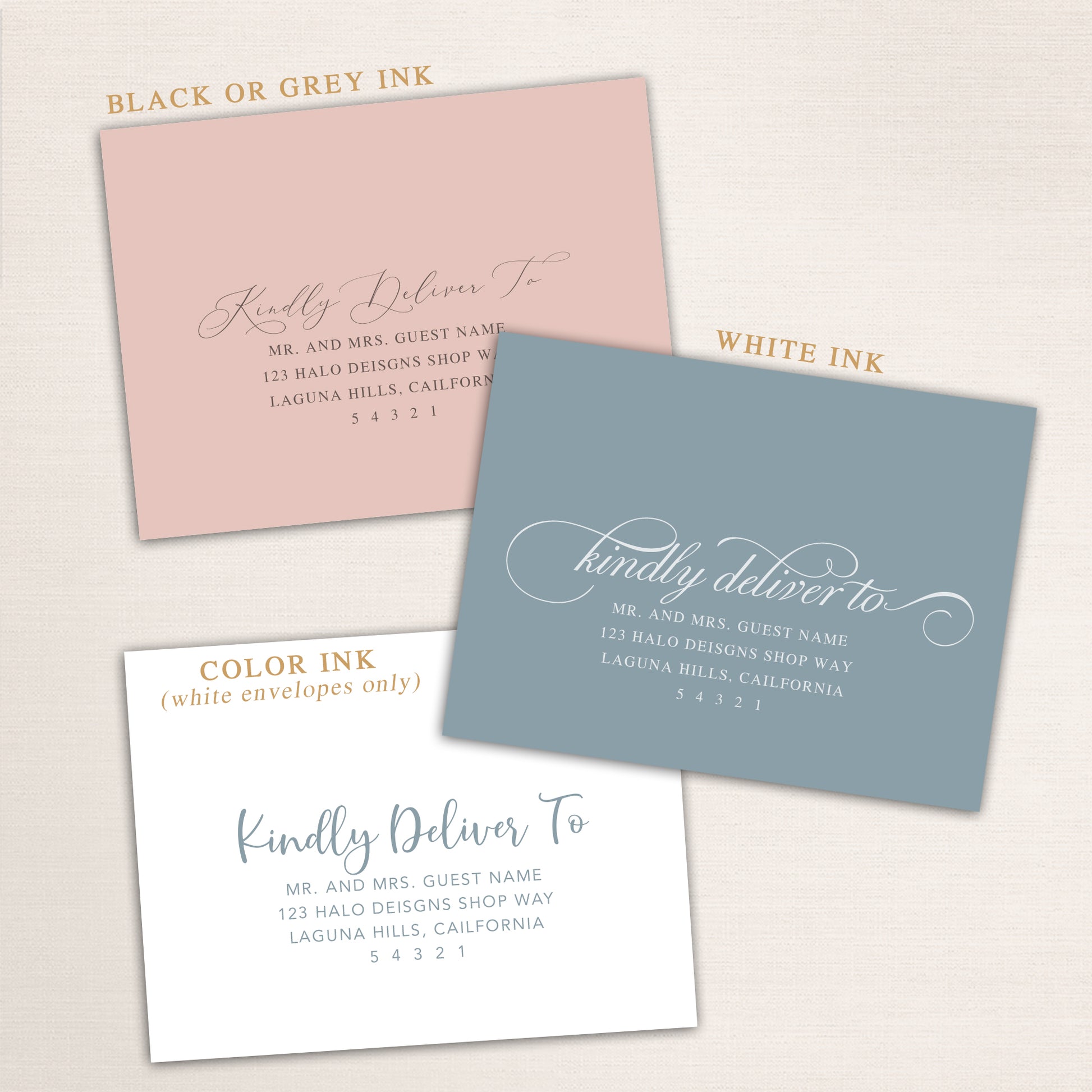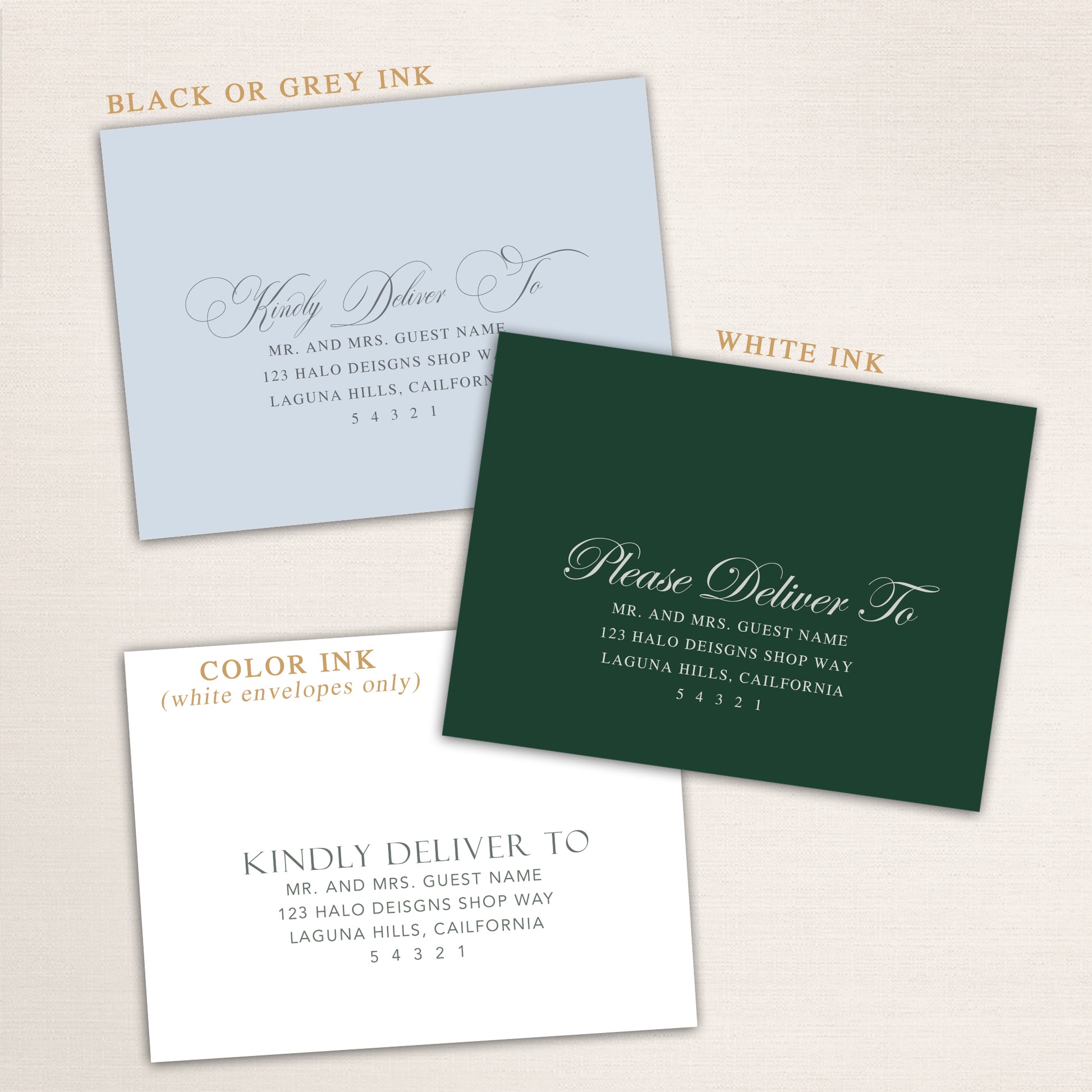 To ensure there are no issues with the USPS sorting machines, no delivery delays, and proper printing, all names and addresses will be printed in block font. We do not offer script addressing. The "kindly deliver to" as shown in the samples may be removed to changed to another short phrase like "you're invited," "thank you," "merry Christmas," etc.