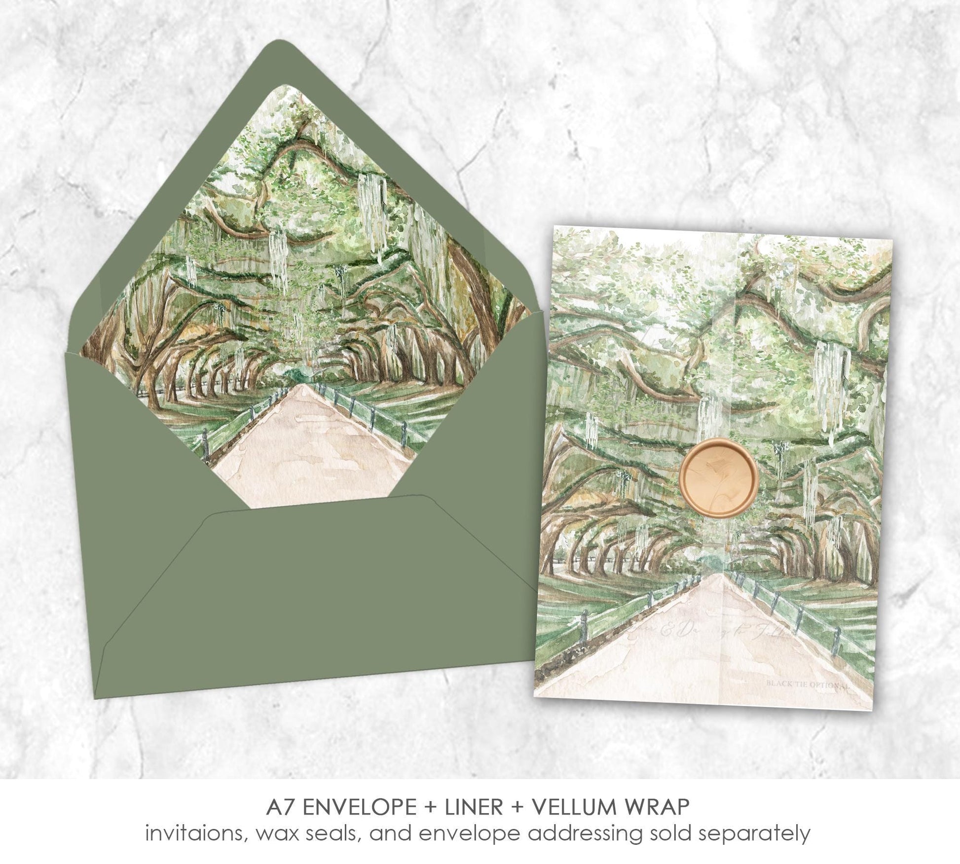 Avenue of the Oaks vellum wraps and envelopes with matching liners. Envelope liners will be glued into the envelopes and the vellum wraps will be shipped flat and scored on one side. When folded these wraps fit perfectly around 5x7 invitations and into the A7 envelopes.