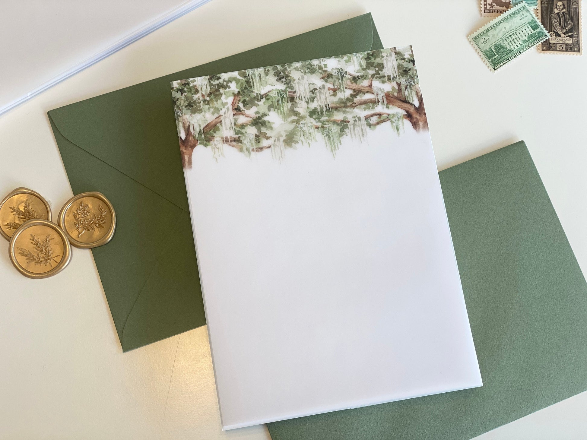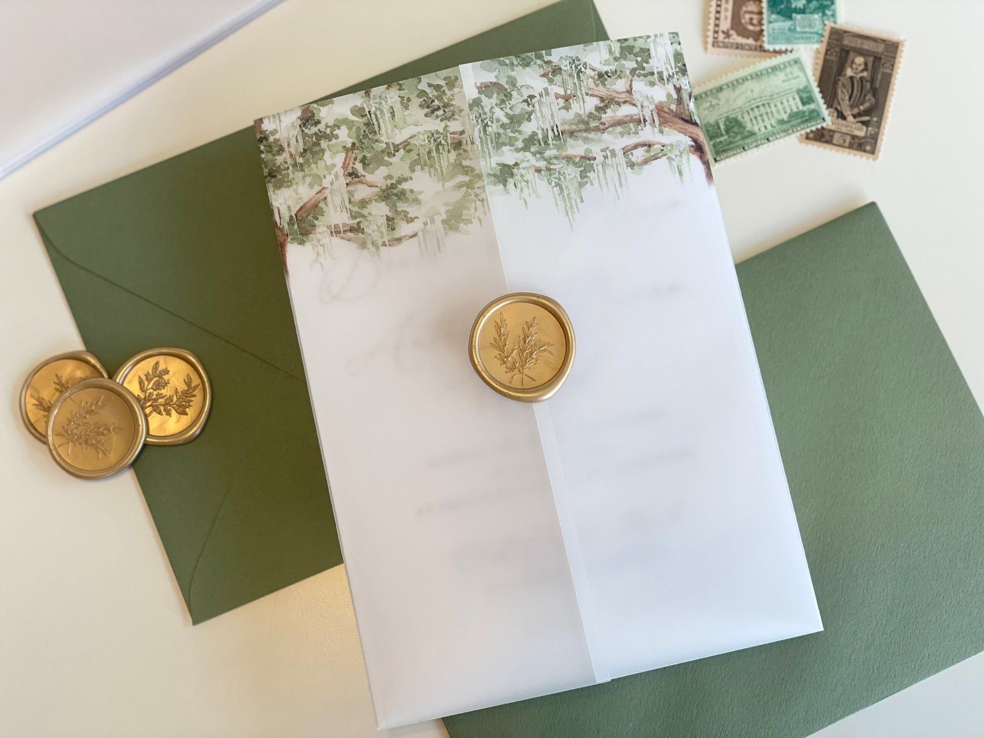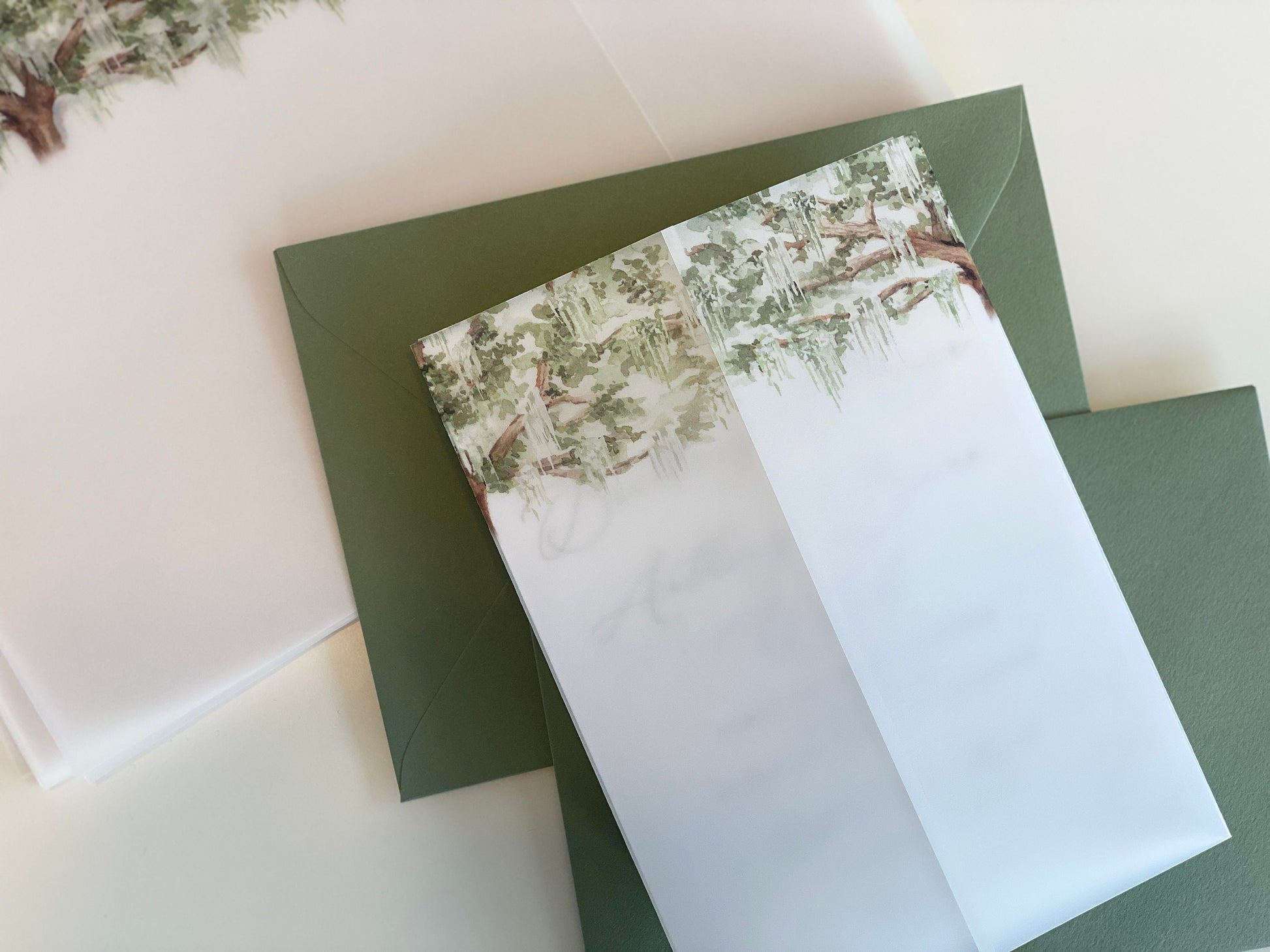 Oak with Spanish moss vellum wraps for your 5x7 invitations. These transparent vellum wraps are lightly scored on one side to make centering around your invite easy. Just fold one side along the score line, slip in the invitation, and then fold the other side for a perfect snug fit.