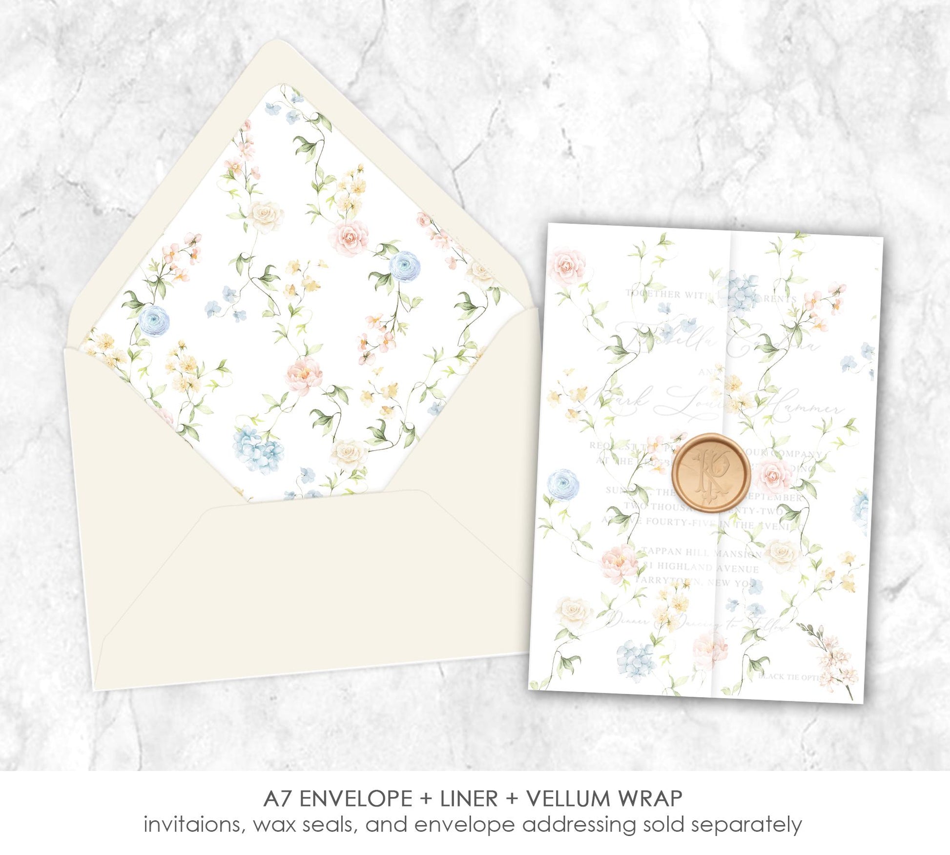 Pastel Floral vellum wraps and envelopes with matching liners. Envelope liners will be glued into the envelopes and the vellum wraps will be shipped flat and scored on one side. When folded these wraps fit perfectly around 5x7 invitations and into the A7 envelopes.