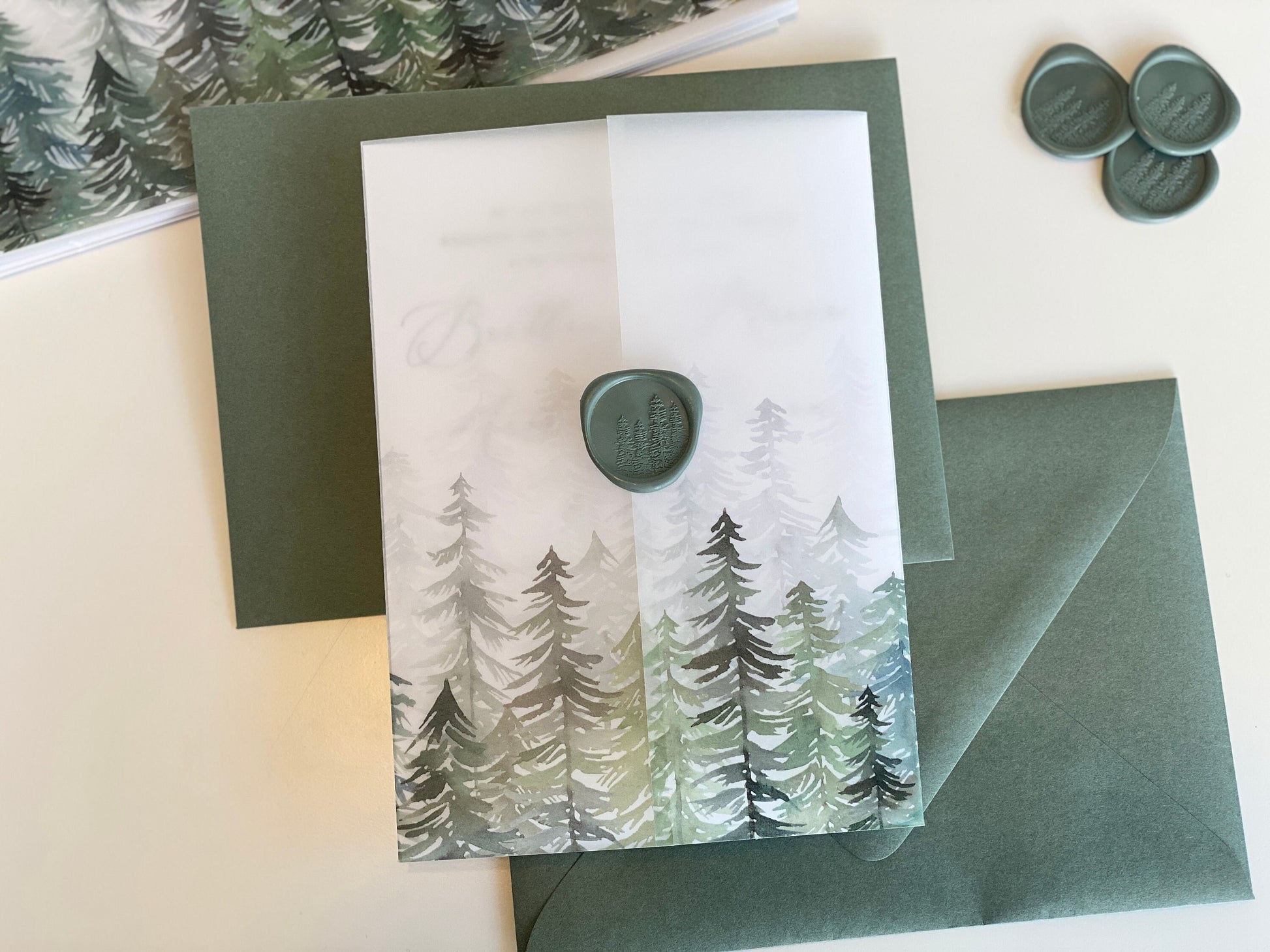 Evergreen vellum wraps for your 5x7 invitations. These transparent vellum wraps are lightly scored on one side to make centering around your invite easy. Just fold one side along the score line, slip in the invitation, and then fold the other side for a perfect snug fit.